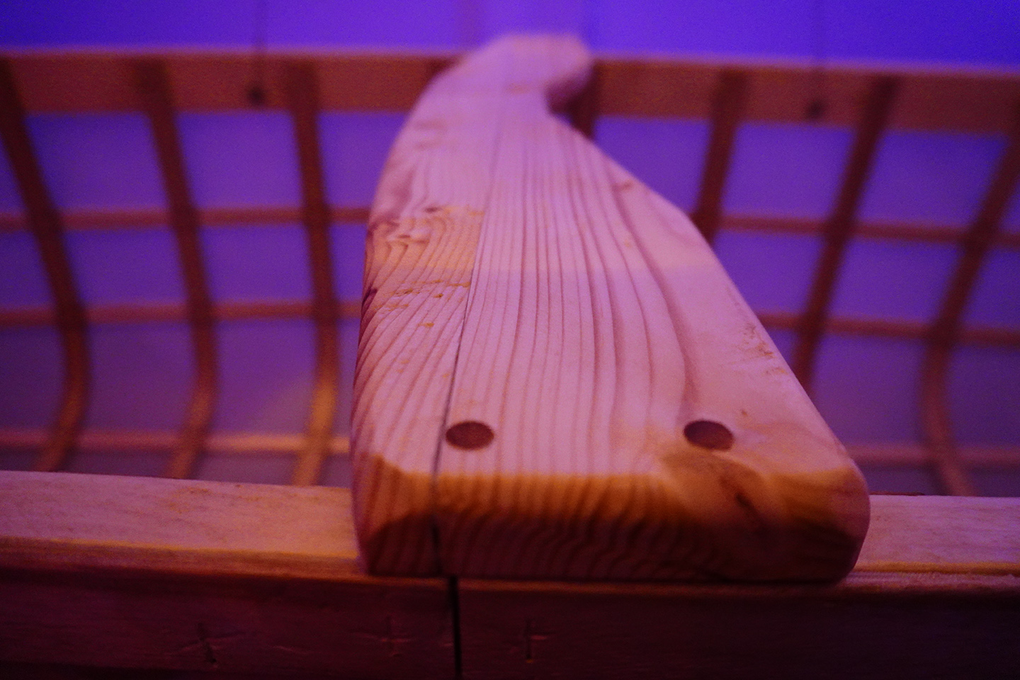 wood, cotton fabric, steel pipe, waxed thread, epoxy, wood oil, stage lights