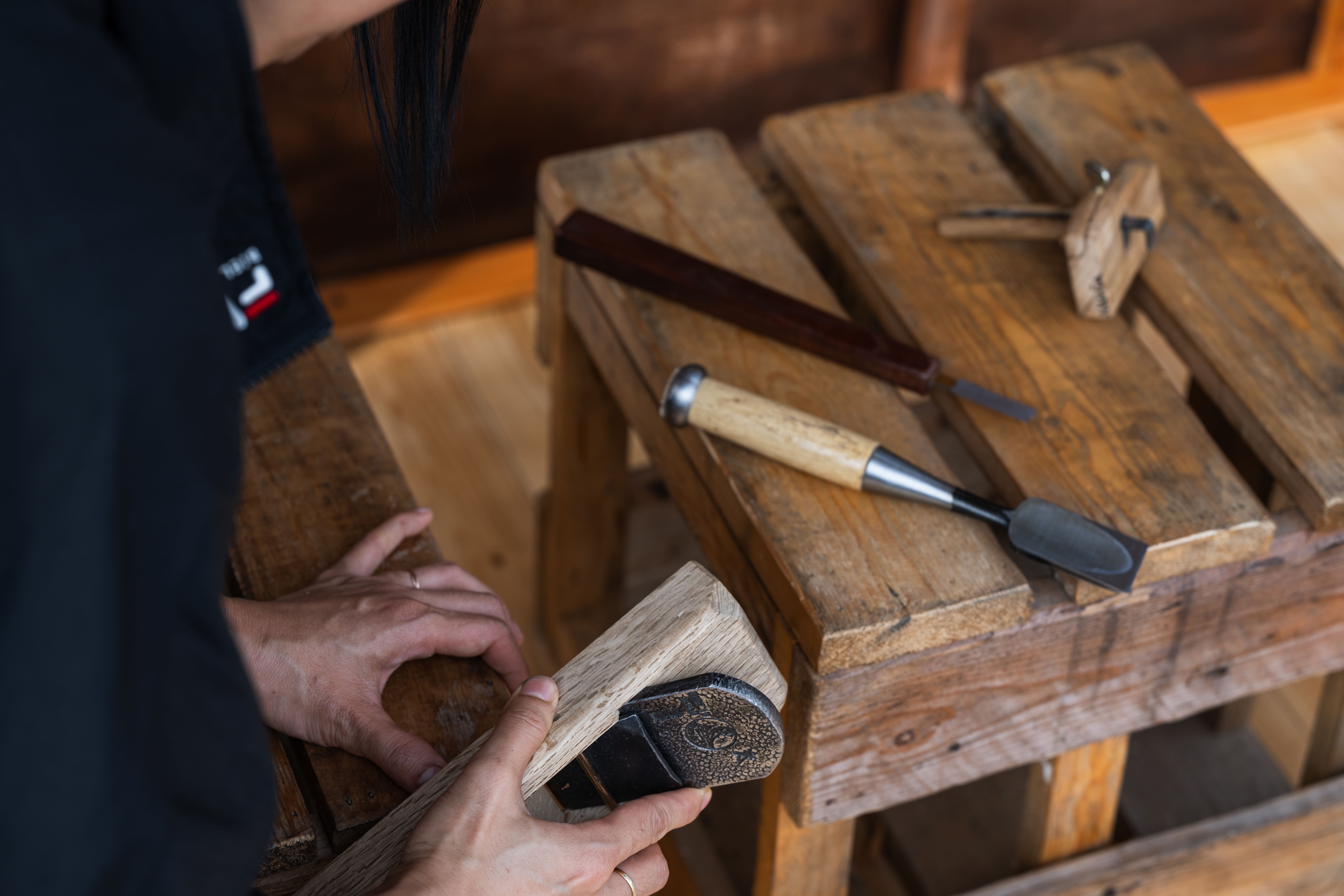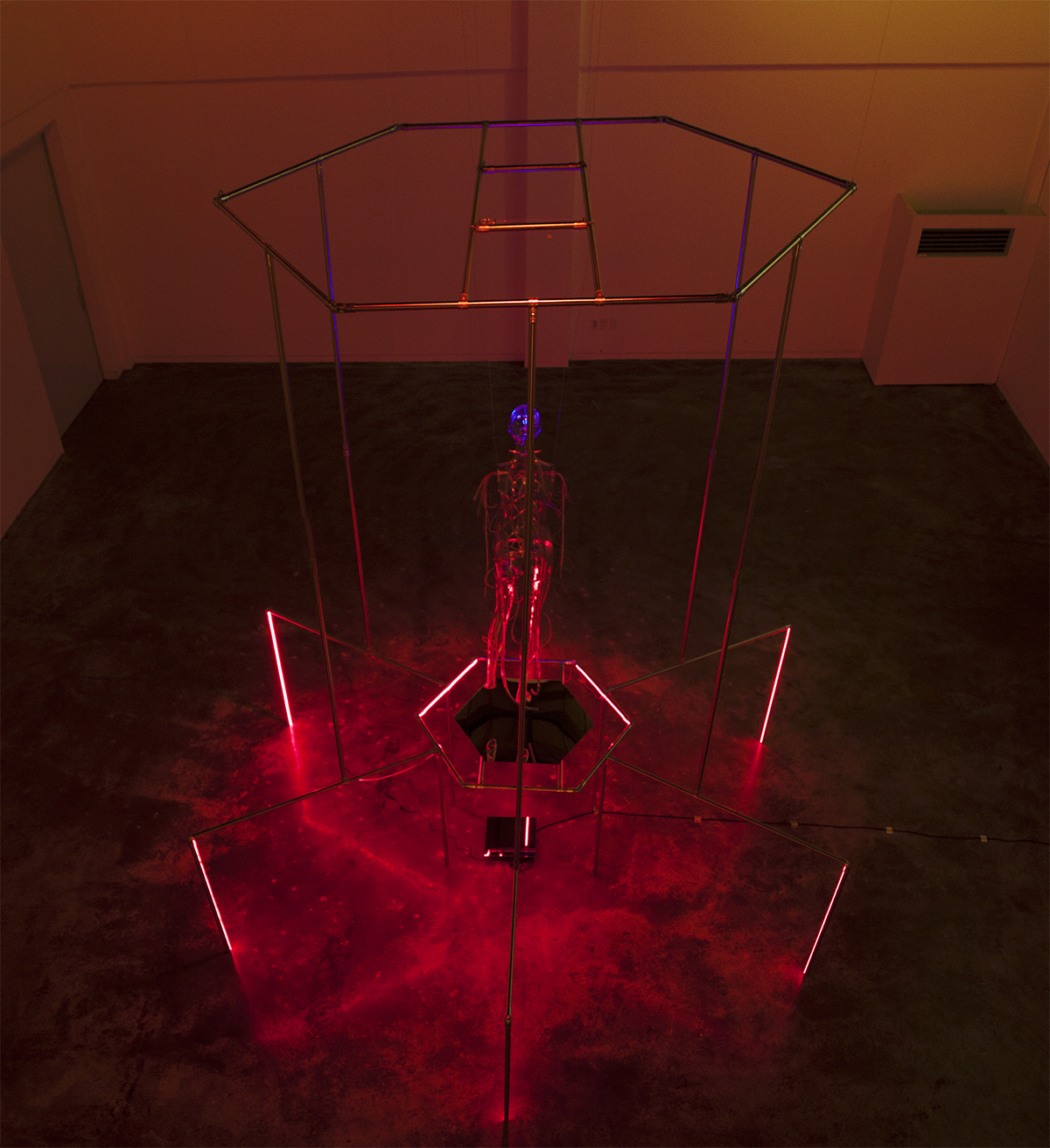 wood, cotton fabric, steel pipe, waxed thread, epoxy, wood oil, stage lights